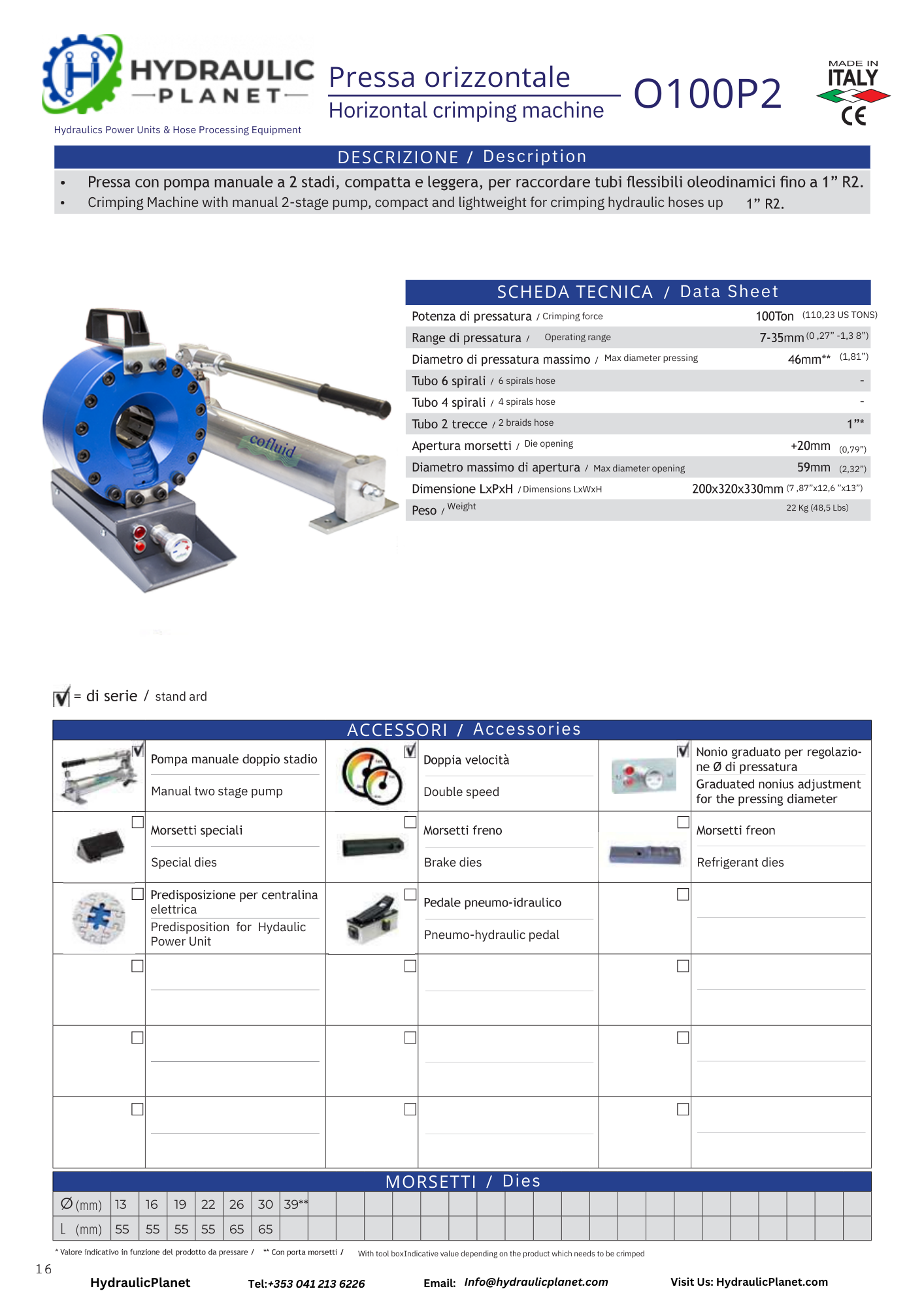 The O100P2 Manual Hydraulic Hose Crimper: portable and lightweight, it delivers precise control with a pneumo-hydraulic pump. Achieve secure connections effortlessly with this versatile crimper. Upgrade to the O100P2 for reliable, portable hose crimping.